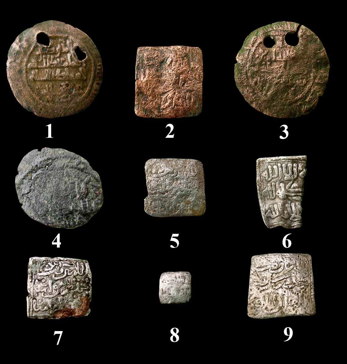 7 Monedas andalusíes de Vaina: 1 a 3: Feluses de cobre, fechables en los primeros momentos de la conquista musulmana. 4: no identificada, de bronce. 5 a 9: dirhems de plata. Todas las monedas son de la colección de don Manuel Ortega. / Foto, J.J.L.A.